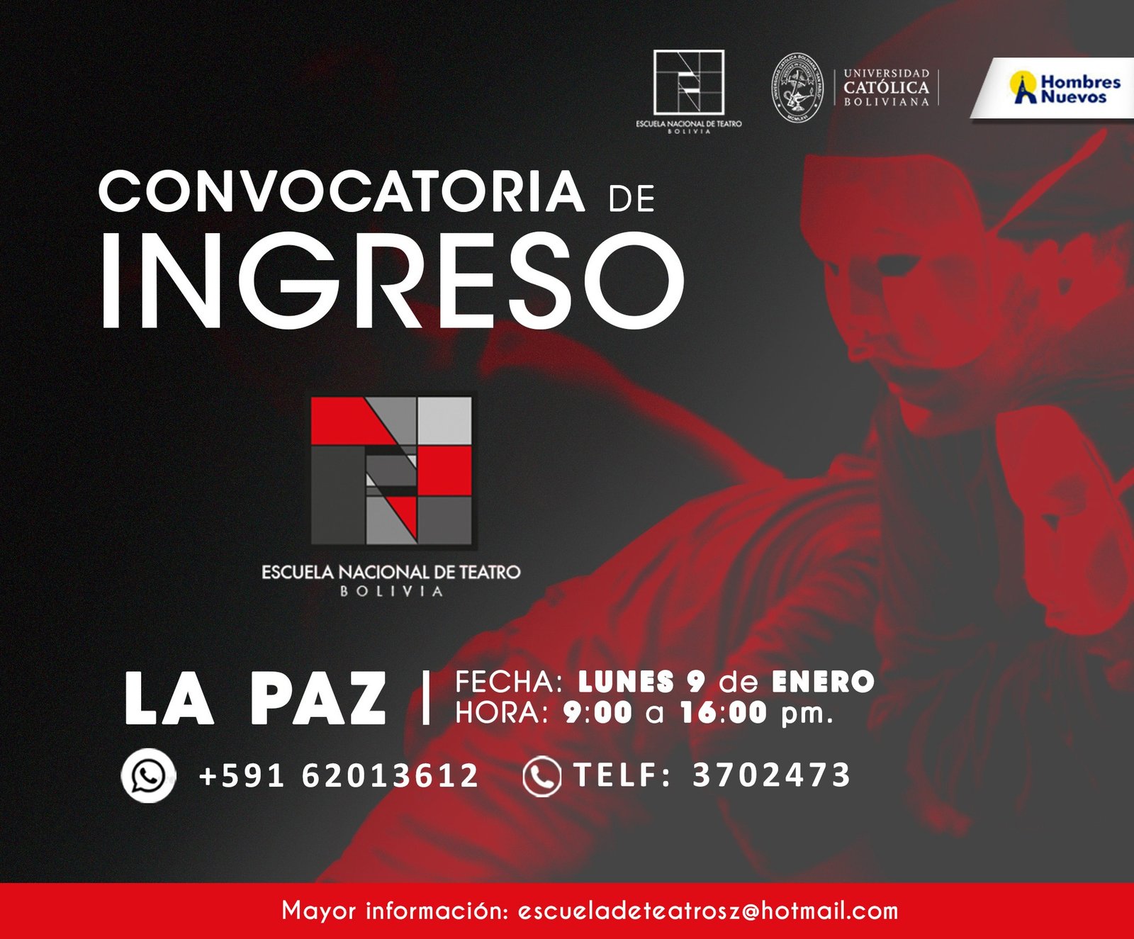 La Escuela Nacional de Teatro en convenio con la Universidad Católica Boliviana «San Pablo» habilita el Programa de Licenciatura en Artes Dramáticas para la Gestión 2022. El estudiante que desee optar por el grado de Licenciatura deberá: Haber concluido el programa correspondiente al Técnico Superior en Teatro con una nota mayor o igual a 85. Inscribirse como estudiante